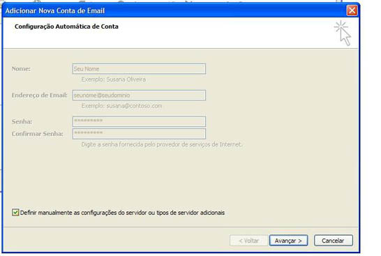 Marque a opção "Definir manualmente as configurações do servidor ou tipos de servidor adicionais" e clique no botão Avançar.