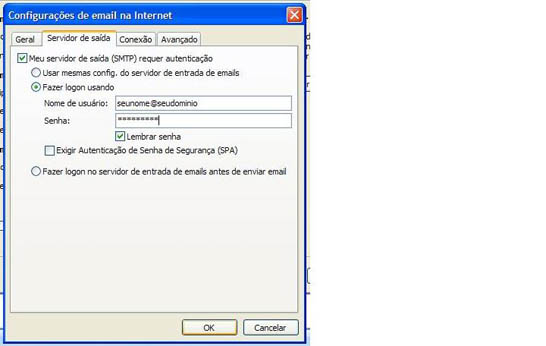 Clique na guia "Servidor de saída" e habilite a opção "Meu servidor de saída (SMTP) requer autenticação", digite seu e-mail completo e sua senha. Clique em ok.