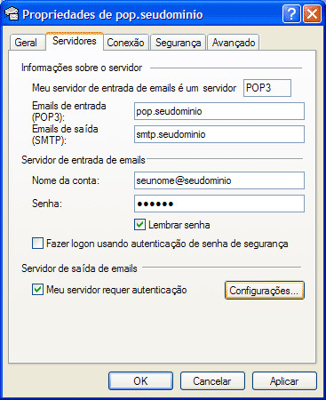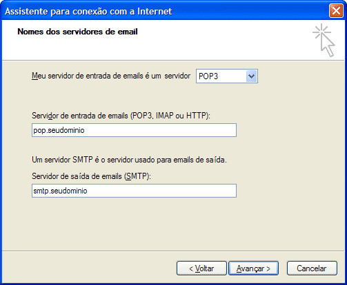 No campo "Servidor de Mensagens Recebidas (POP3)" informe "pop.seudominio";