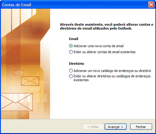 Marque a opção "Adicionar uma nova conta de email" e clique em Avançar;