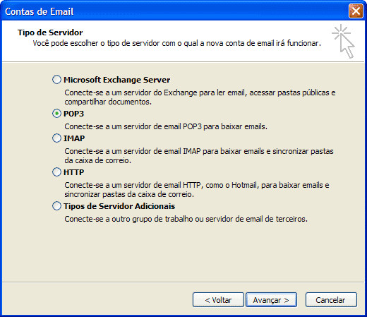 Na janela "Tipo de Servidor", selecione a opção "POP3" e clique em Avançar;