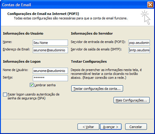 No campo "Servidor de entrada de emails (POP3)" digite "pop.seudominio";